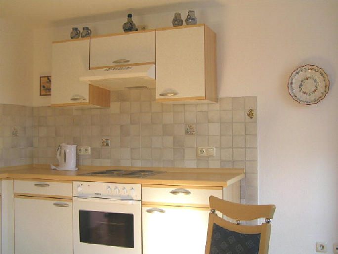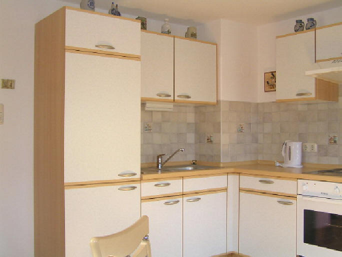 Radio, Kühlschrank, Herd mit Backrohr, Kaffeemaschine, Wasserkocher.